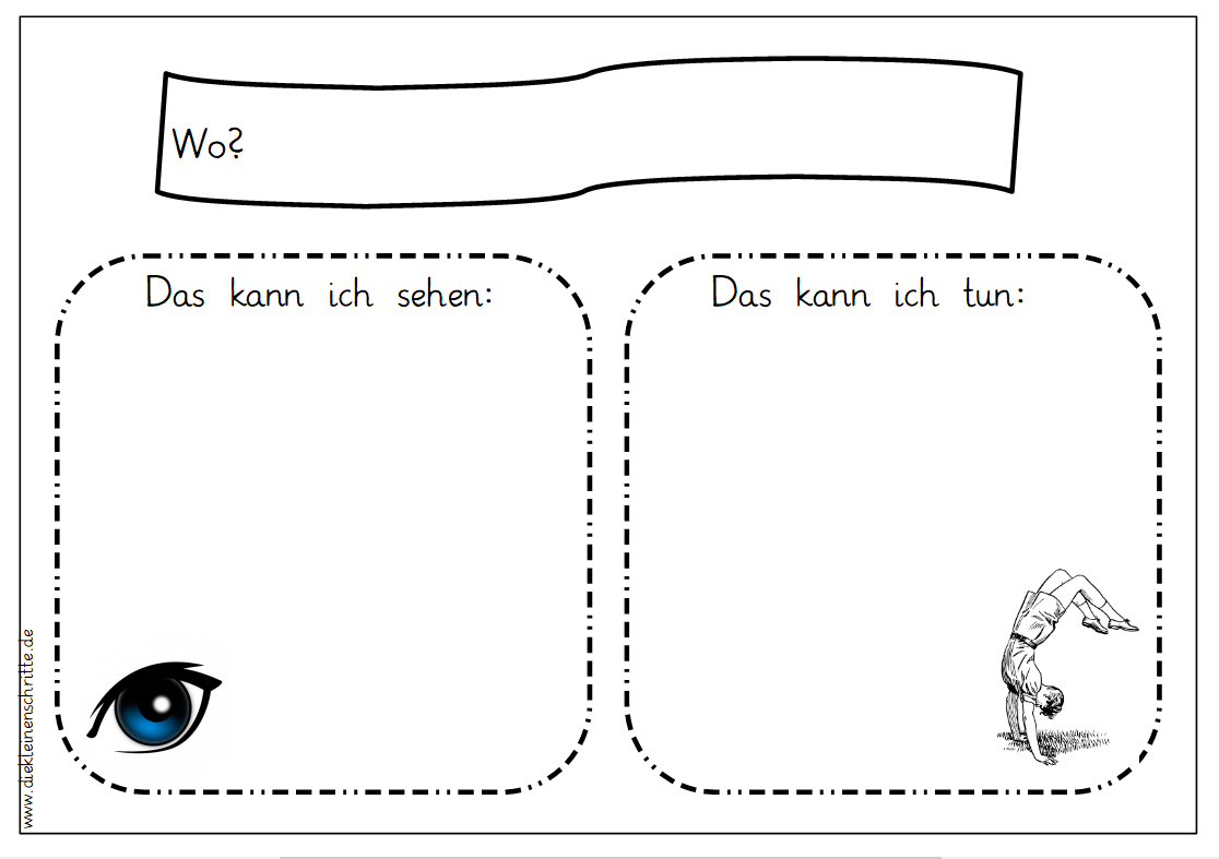 Jedem Kind fallen sicher mindestens zwei Dinge ein, die es im Wald sehen kann und auch zwei Handlungen, die es tun kann. Dabei muss es auf dem AB nur einzelne Wörter aufschreiben.